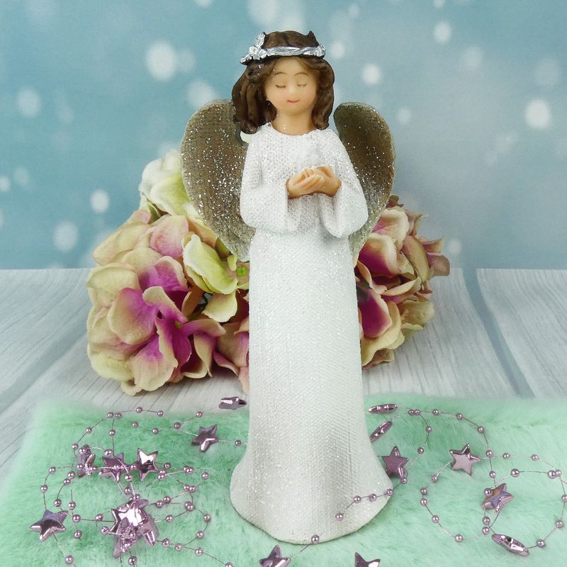 Půvabná figurka andílka v krémových dlouhých šatech. Andílek má na hlavě stříbrný věneček a v rukou drží holubičku. Figurka je zdobená glitry, díky nimž se na světle krásně třpytí.