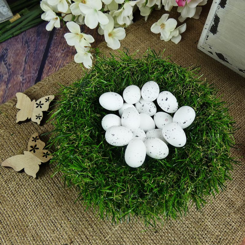Dekorativní vajíčka v bílé kropenaté barvě jsou vyrobena z polystyrenu a skvěle se hodí k vytváření velikonočních aranžmá.