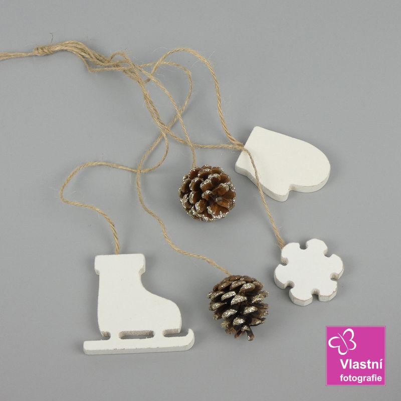Vánoční závěsná dekorace, kterou tvoří dřevěná brusle, rukavice a vločka v bílé barvě a dvě šišky zdobené zlatými třpytkami.