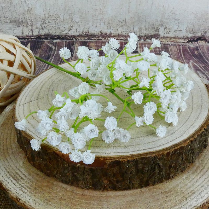 Na větvičce je několik malých kvítků v bílé barvě. Květy jsou latexové, stonek plastový. Gypsophila je velmi vhodná do vázy nebo aranžování s jinými květinami.