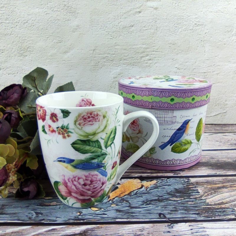 Pěkný porcelánový hrneček s motivem růží a ptáčků v papírové dárkové krabičce. Udělejte tímto hrnečkem radost sobě nebo svým blízkým.