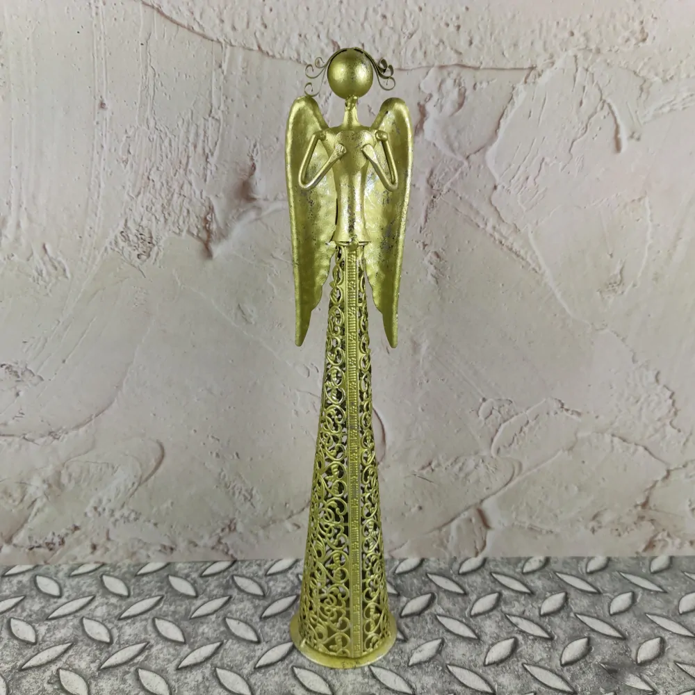 Plechový anděl ve zlaté barvě ozvláštněné patinou. Sukně je zdobena zajímavými průřezy.