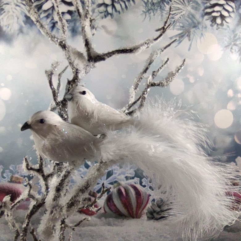 Dekorační ptáček na klipu v bílé barvě, s dlouhým peříčkovým ocáskem. Zdobený glitry.